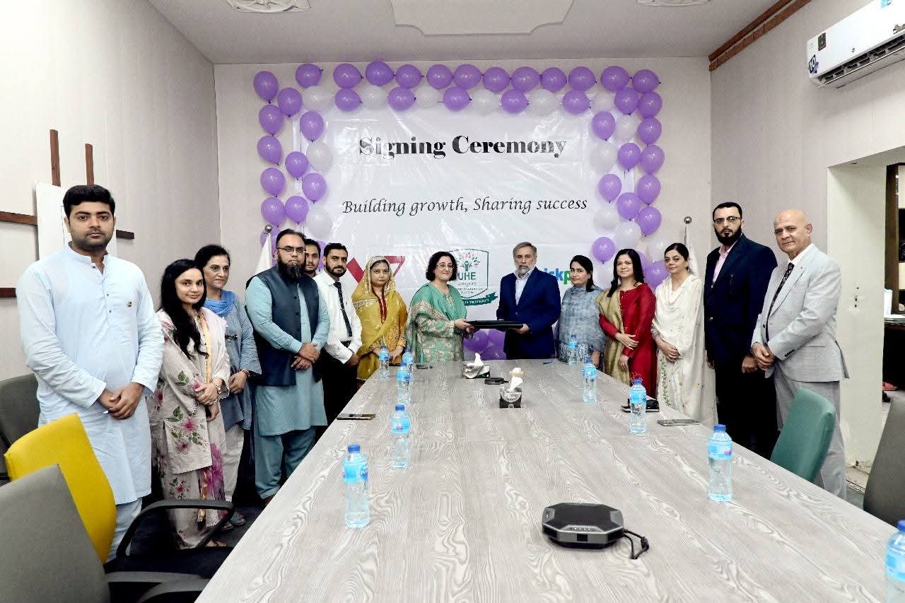 The signing ceremony at UHE was attended by senior officials, including Mr. Faisal Hussain, (Head Business) Mr. Irfan Malik (Head Operations), Ms. Sakina Alam (Head HRD), Ms. Mobina Tariq (RBH Central), and Ms. Madiha Naz (Registrar UHE).